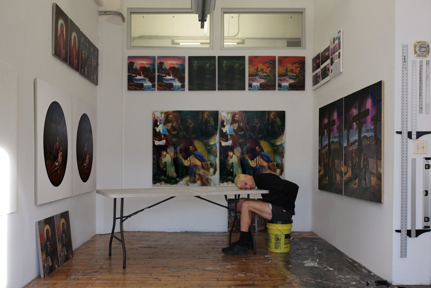 Rather than focusing on repetition itself, his practice is an effort to see how the first in a series appears among its counterparts. For this work, Gillette paints the same subject ten, twelve, sixteen times over. Each painting shifts in small ways—angle, focus, color, execution—creating a coherent, yet ultimately meaningless, collection of works. His subject matter includes traditional still lives, saccharine landscapes, religious iconography, airbrush sports fields, and nonrepresentational fields of color or pattern. His works point to fine art hierarchies around painting and representation, and challenge the auratic art object as much as its revered subjects.